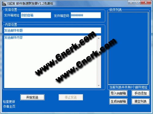 只需寫入你的信箱地址和密碼,就可以免費(fèi)群發(fā)郵件。軟件無后門和木馬代碼,運(yùn)行速度快,占內(nèi)存小,群發(fā)速度快。(發(fā)送1000個(gè)地址只短短幾秒)