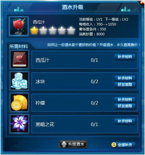 點擊游戲下方的酒水圖標,可以看到酒水的現(xiàn)存狀況和調(diào)制酒水、提升酒水等級等功能。只有在 酒水充足情況下才能更快的賺取鈔票,所以各位玩家要及時補充酒水喲。