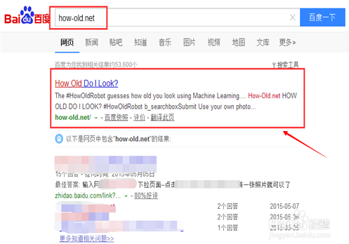 1、首先在百度上搜索【how-old.net】,找到如下圖這個(gè)官方網(wǎng)站,點(diǎn)擊進(jìn)入how-old net首頁?;蚴强梢灾苯釉诘刂窓阪I入上面地址,直接進(jìn)入首頁。