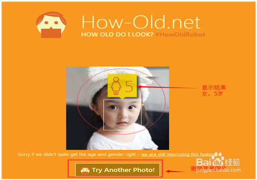 4、測試的時(shí)候需要幾秒的時(shí)間,馬上就能看到分析出來的照片圖像年齡結(jié)果,如下圖,我們看到一個(gè)數(shù)字和一個(gè)圖標(biāo),圖標(biāo)表示是性別,數(shù)字就是測試出來的年齡啦,相比之下,測試結(jié)果還是蠻準(zhǔn)確的。點(diǎn)擊圖片下方【try another photo】可以更換其他照片測試。