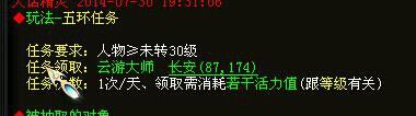 1、五環(huán)任務(wù),30級(jí)可做跟新大話2的五環(huán)不一樣的地方是前期活力消耗很低(后面會(huì)詳細(xì)介紹活力)只要幾十點(diǎn),當(dāng)然獲得的游戲幣也只有2W多,小技巧:不帶新人跑師門貢獻(xiàn)跟游戲幣收益是1:1,而帶新人跑游戲幣收益多加25%,師門貢獻(xiàn)減少25%。記得帶人哦!另外補(bǔ)充說(shuō)明的一點(diǎn),免費(fèi)版取消了活力影響收益的情況,也就是活力值為0也一樣可以拿到正常的五環(huán)任務(wù)收益。