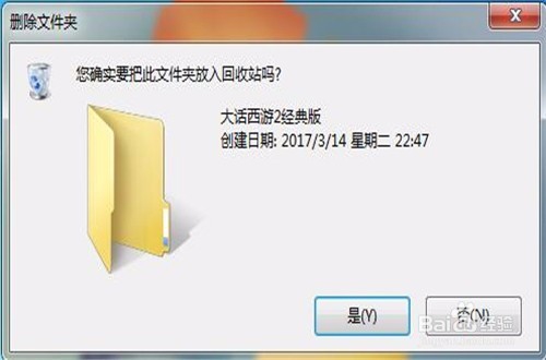 2、我們鼠標(biāo)右鍵點(diǎn)擊這個(gè)大話西游2的文件夾,會(huì)彈出一個(gè)選項(xiàng)卡,我們?cè)诶锩纥c(diǎn)點(diǎn)擊“刪除”,彈出一個(gè)確認(rèn)對(duì)話框,點(diǎn)擊“確定”,即可將大話西游2文件刪除到“回收站”。