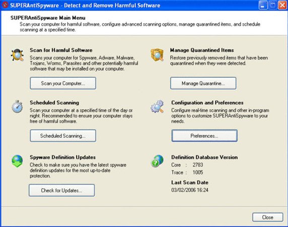 SUPERAntiSpyware是市面上唯數(shù)不多的能夠完整掃描出間諜軟件的工具之一。SUPERAntiSpyware的界面非常簡單,主要分為:掃描計(jì)算機(jī),管理免疫過的程序,掃描日程管理,系統(tǒng)設(shè)置和代碼庫在線更新,你只需一路點(diǎn)擊下一步就可以清查、刪除計(jì)算機(jī)中的垃圾間諜軟件了。此外,它還支持實(shí)時(shí)防護(hù)功能,能夠保護(hù)你的IE瀏覽器不被流氓軟件修改。