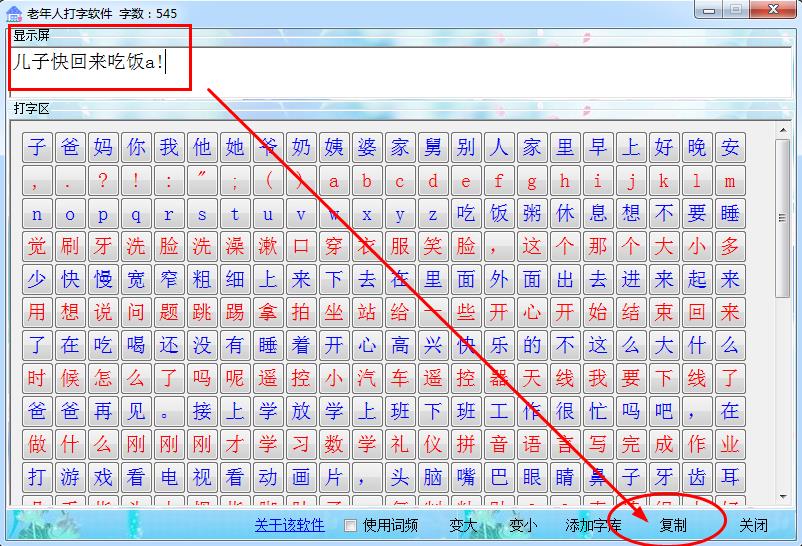 這是一款給一些識字但不懂得拼音五筆的老年人或者幼兒園的小孩打字的軟件.軟件的原理很簡單,只要讓兒女輸入一些常用的字到字庫,字庫中字會顯示在界面提供給老年人選擇,選擇組成一串句子后點復制,接著就可以把復制的句子粘貼到其他的地方.