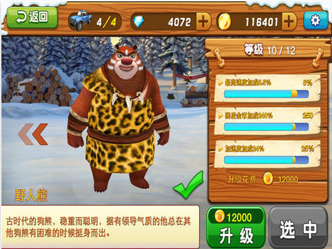 作為3D卡通風格的卡丁車游戲,雪嶺熊風玩起來有早期《跑跑卡丁車(微博)》的即視感,但和神作《馬里奧賽車》差距還非常大。因為這個玩法與電影本身的關(guān)系不大,所以定義成衍生游戲更合適。游戲的主要模式包括以跑圈時間算分的全服挑戰(zhàn)賽和休閑模式,休閑模式,即PvE則分成競速、限時和末位淘汰賽。作為常規(guī)設(shè)定,車手和車輛的成長是除賽車環(huán)節(jié)外的重頭戲。玩家可以選擇的角色包括熊大、熊二、小熊熊和野人熊,不過后兩個強力角色需要充值才能解鎖。車輛也一樣,免費的有吉普車和肥皂車(吐槽無力),需鉆石開啟的肌肉車和復(fù)古跑車數(shù)值更彪悍。在賽車環(huán)節(jié),除了你死我活的拼命使用道具和吃金幣外,能撞飛擋道的各種小車也是很有意思的。