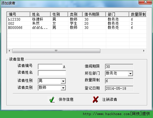讀者信息管理:對讀者進行注冊登記、注銷讀者、查閱借閱記錄等操作。