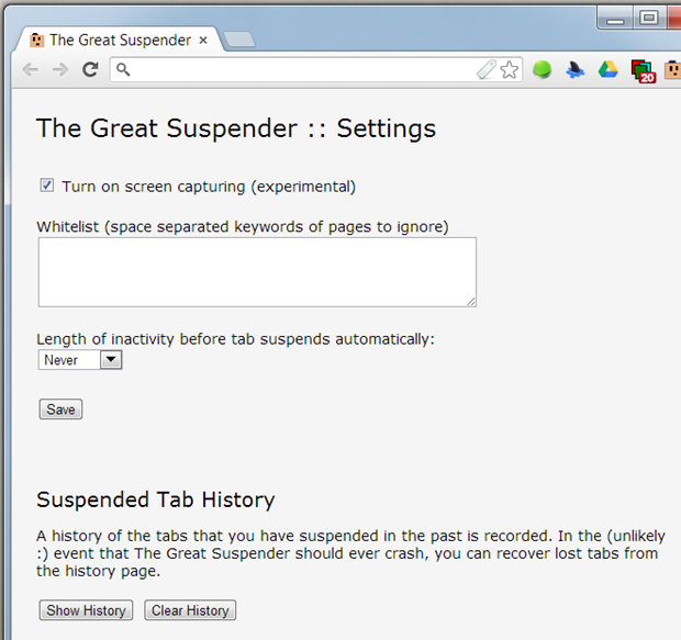 很多使用Chrome瀏覽器的同學(xué)都有內(nèi)存占用過多的困擾,The Great Suspender這個(gè)擴(kuò)展就可以解決這個(gè)問題,它可以讓你把不需要的標(biāo)簽進(jìn)入睡眠模式以節(jié)省優(yōu)化內(nèi)存,保證流暢的瀏覽體驗(yàn)。不同于其他類似擴(kuò)展,The Great Suspender 提供兩種休眠方式: 手動(dòng)休眠、或者一段時(shí)間不使用自動(dòng)休眠。擴(kuò)展還支持白名單,無論自動(dòng)休眠還是手動(dòng)休眠,白名單中的網(wǎng)站是不會(huì)休眠的。