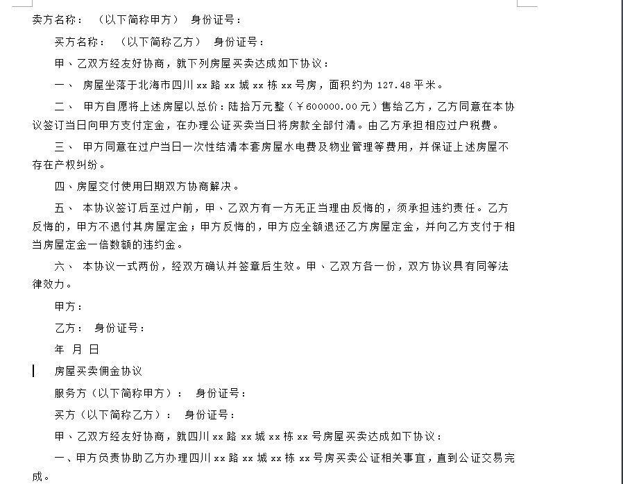 一﹑ 房屋坐落于北海市四川xx路xx城xx棟xx號(hào)房,面積約為127.48平米。