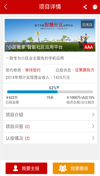 眾投邦是一款專門為創(chuàng)業(yè)者與投資者打造的綜合服務(wù)平臺(tái),它能為雙方架起一座橋梁,讓雙方進(jìn)行更好的溝通,每天還會(huì)為你提供最新的業(yè)界資訊與專家資訊等等,讓你對(duì)投資更加的了解。