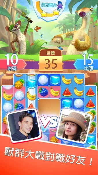 本作為一款讓玩家們《冰原歷險記》系列熟悉的三名主角~樹懶「喜德」(Sid)、長毛象「蠻尼」(Manny)與劍齒虎「狄亞哥」(Diego)等一起展開新冒險的動作益智游戲,游戲中采用讓玩家們將直線、橫線與斜線三個以上的相同水果湊齊在一起就能將之消去的三消型益智玩法,讓玩家們在三消益智過程中與喜德等夥伴一起來展開一場古代秘寶探索尋寶之旅!而且游戲中不但將會收錄各式各樣系列角色登場之外,還將會加入各種有趣的小游戲玩法讓玩家們來挑戰(zhàn),同時游戲內(nèi)也將會加入 PvP 的對人戰(zhàn)模式,讓玩家們可以與朋友來一較高下,一起享受本作的豐富游戲樂趣!