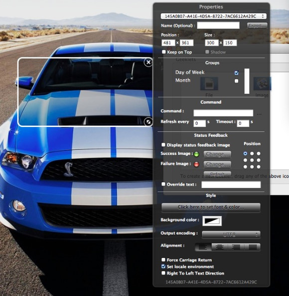 比如: – Geeklet 顯示窗口的尺寸和位置 – 所屬分組 – Command(這是核心編輯部分,你可以將腳本輸入進(jìn)去) – 定義數(shù)據(jù)刷新時(shí)長(zhǎng)(以秒為單位),定義超時(shí)時(shí)長(zhǎng)(以秒為單位) – 是否顯示狀態(tài)反饋按鈕(按鈕圖片可自定義,并選擇顯示位置,默認(rèn)在左上角) – 是否以文本替代狀態(tài)反饋按鈕 – 設(shè)定文本樣式(字號(hào),字體等值,調(diào)用的是 OS X 系統(tǒng)字體設(shè)置工具) – 設(shè)定文本背景色 – 設(shè)定文本輸出編碼 – 設(shè)定文本放置位置