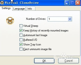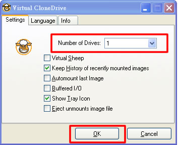 1. 開啟Virtual CloneDrive設(shè)定視窗後,「Number of Drives」欄位可以設(shè)定虛擬光碟機(jī)的數(shù)量,用量不多的話就設(shè)定為「1」,開一臺(tái)使用就好。最多可以設(shè)定到15臺(tái),另外我們也可勾選「Automount last Image」,讓Virtual CloneDrive自動(dòng)掛載上次使用過的光碟映像檔,方便我們快速取用映像檔中的資源,如果勾選上面的「Virtual Sheep」選項(xiàng),「我的電腦」視窗里的虛擬光碟機(jī)圖示會(huì)變成Virtual CloneDrive軟體的羊頭圖示,便於跟其它光碟機(jī)在視覺上作區(qū)隔。