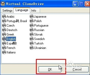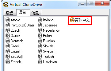 2.Language設(shè)定頁簽中,可以挑選不同的軟體語言介面,不過目前12種語系中,還沒有繁體中文版本的語系,日後如有找到中文語系檔的話,可以直接把它放到「C:\Program Files\Elaborate Bytes\VirtualCloneDrive\Texts」資料夾中,再到這個(gè)設(shè)定頁面中點(diǎn)選,就可以切換成中文版來使用。