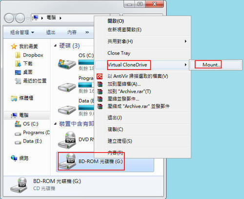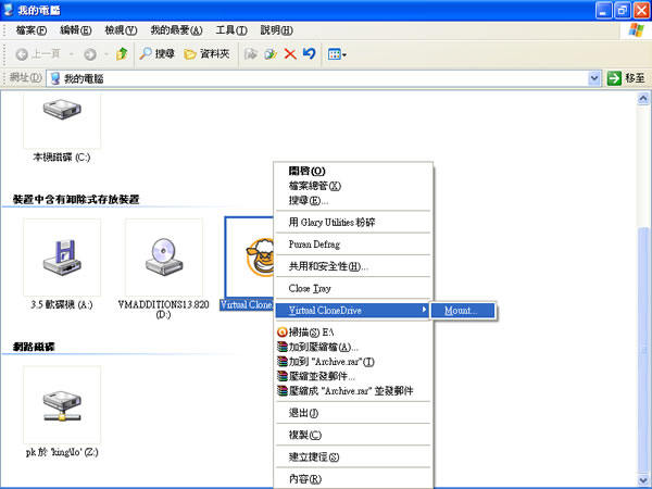 3.當(dāng)需要將某個(gè)光碟映像檔掛載成光碟機(jī)的時(shí)候,可以在桌面「我的電腦」圖示按兩下開啟「我的電腦」視窗,然後在Virtual CloneDrive虛擬光碟機(jī),按滑鼠右鍵,再點(diǎn)選[Virtual CloneDrive] > [Mount...],另外也可以在安裝好Virtual CloneDrive軟體後,直接按兩下ISO檔,便可自動(dòng)掛載成虛擬光碟。