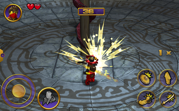 樂高幻影忍者游戲操作簡答通過搖動左下角的虛擬搖桿控制角色上下左右操作,而右下方有跳躍、格擋、投技和攻擊四種操作。當(dāng)能量槽滿了,玩家便可以點擊虛擬搖桿左方的技能按鍵發(fā)動必殺技能。這種操作常應(yīng)用于動作類游戲,相信玩過這類型游戲的玩家不會感到陌生。每擊殺一個敵人的時候,會掉落一定數(shù)量的齒輪和隨機掉落恢復(fù)血量的紅心道具。當(dāng)血量為零的時候,游戲就要結(jié)束了。小編在這里給大家一個提示:敵人的攻擊是有先后順序的,不要因為一大堆人包圍上來而驚慌失措。戰(zhàn)斗的時候細(xì)心就會發(fā)現(xiàn),當(dāng)敵人有進攻的舉動之前,身體會被紅光包圍著身體并維持大概2秒的時間,玩家可以優(yōu)先選擇攻擊發(fā)光的敵人打斷他的進攻動作。