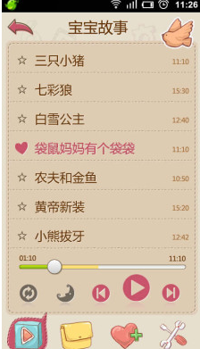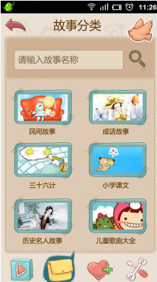 寶寶故事是一款體積僅400K,安全綠色,無廣告,功能專業(yè)的兒童教育APP應(yīng)用,由蘑菇娃工作室兒童教育專家和移動互聯(lián)網(wǎng)專家聯(lián)合設(shè)計推出.經(jīng)過2年時間的培育和優(yōu)化,在中國已經(jīng)100多萬的家長使用寶寶故事.使用寶寶故事媽媽放心,孩子聰明.寶寶故事包含兒童睡前故事,兒童歌曲大全,胎教音樂,寓言故事,民間故事,唐詩,成語故事,三十六計,小學(xué)一二三四年級課文朗讀,中國歷史故事,童話連載系列故事,歷史名人故事.共計十大類故事大全,寶寶故事精心挑選和制作出許多經(jīng)典動聽的故事,每周保持更新,讓你不再為講故事而煩惱.