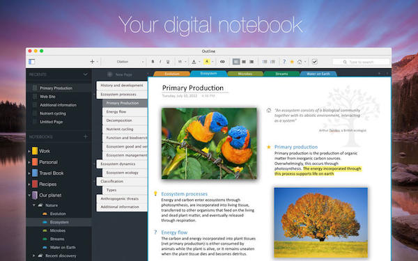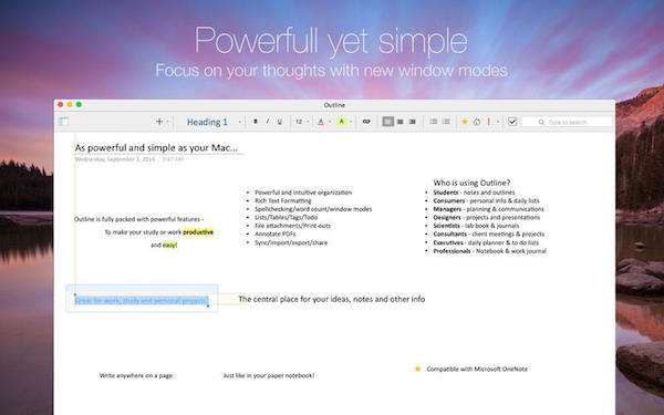 Outline是Mac OS平臺上一款非常好用的記事本軟件,該軟件擁有和紙質(zhì)記事本一樣的特性,含有筆記本、 節(jié)、 分區(qū)和頁的組等功能,同時Outline還支持與Windows PC 和其他設(shè)備同步,有效的提高你的辦公效率。