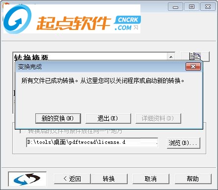點(diǎn)擊“轉(zhuǎn)換”按鈕,轉(zhuǎn)換完成后出現(xiàn)二圖所示對(duì)話框,如果還有新的PDF轉(zhuǎn)換,就點(diǎn)擊“新的轉(zhuǎn)換”,如果沒(méi)有就點(diǎn)擊“退出”。