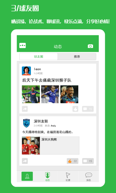 綠茵場(chǎng)app,是一款為足球愛(ài)好者們準(zhǔn)備的多功能交流平臺(tái)!自己一個(gè)人玩足球,寂寞不?打開(kāi)綠茵場(chǎng),球友集合,大家相互切磋球藝,組織比賽,足球是一個(gè)多人的活動(dòng),不要一個(gè)人埋頭苦練了,下載綠茵場(chǎng),來(lái)一場(chǎng)久違的比賽吧