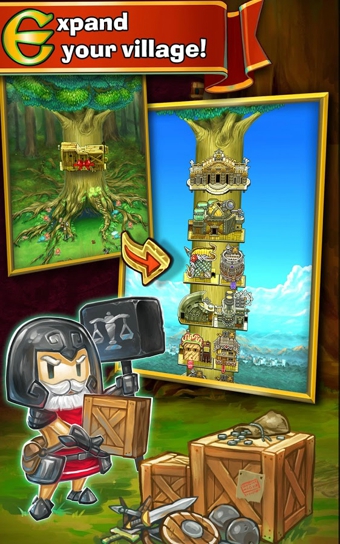 《神樹小奇兵》可謂讓人眼前一亮。玩家出生在一棵世界樹上,主要角色都住在樹冠上的樹屋里,每人一座小別墅,而被解救的村民和功能性建筑則修在樹干上。世界樹的樹干可以不斷長高,每長高一個單位需要一粒橡樹子(主線會送)。如果不花錢的話,空間往往會比較吃緊,剛好擺不成你想要的樣子,不過隨機刷出的資源關(guān)有時也會出現(xiàn)送橡樹子的關(guān)卡(通常是困難難度)。