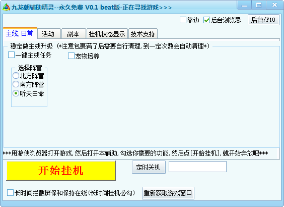 本輔助基于屏幕識圖和按鍵模擬技術,請勿將游戲窗口最小化,請保持游戲窗口盡量大。如確實需要隱藏,可點擊輔助右上角的“后臺瀏覽器”按鈕。