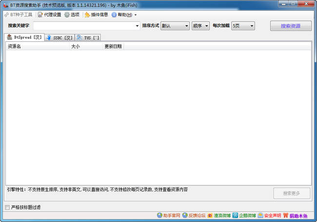 BT資源搜索助手是一款基于各大BT搜索引擎而開發(fā)的資源搜索輔助工具,能夠支持btspread、ssbc、tpse和tus四大搜索引擎,支持代理服務(wù)器。BT資源搜索助手并不是P2P的,所以資源搜索速度沒有搜索神器那么快,但軟件整合若干BT資源搜索引擎,意在為資源的搜索和使用提供更加簡單便捷的方法。