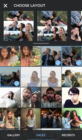 在選擇圖片的篩選設(shè)置中,你可以選擇底部的「面孔」,Layout 會(huì)自動(dòng)篩選出有面孔的照片,方便自拍控們和朋友聚會(huì)時(shí)使用。