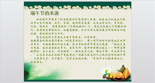 端午節(jié)的由來PPT模版 免費(fèi)版 這是一份介紹端午節(jié)由來的PPT模版,模版以粽子這個(gè)端午節(jié)的標(biāo)志物為背景圖片,突出主題。整篇PPT主要采用了文字?jǐn)⑹龅男问浇榻B了兩個(gè)不同的端午節(jié)的由來,并輔以圖片,使得整個(gè)模版更加生動(dòng)形象。此模版適用于各種介紹端午節(jié)的場(chǎng)合使用,喜歡的朋友可以下載下來哦。