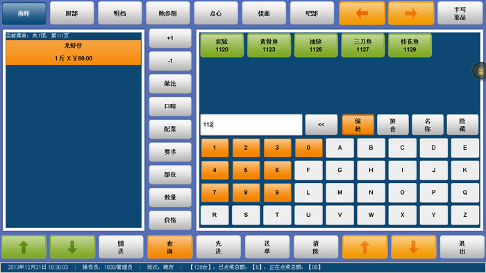 1)主界面美觀、操作簡單、快捷,主要功能在小鍵盤上即可完成,支持圖形點菜、編碼點菜、拼音簡碼點菜,錄入方式可自動切換,能極大地提高前臺營業(yè)的效率。