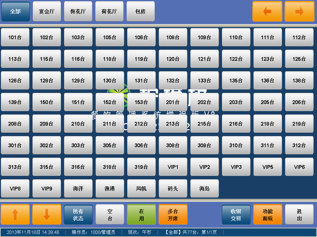 后臺模塊:系統(tǒng)管理、菜品管理、房臺管理、打印管理、倉庫管理、設(shè)備管理、客戶管理、電子點菜、報表中心;