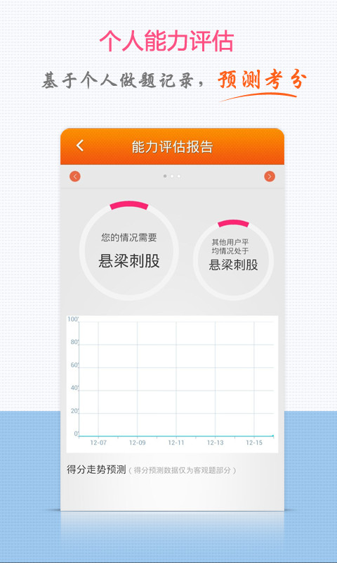 學(xué)員進(jìn)行了網(wǎng)校模擬題、真題、智能組卷等練習(xí)后,系統(tǒng)會(huì)根據(jù)測(cè)試記錄, 綜合分析學(xué)員的知識(shí)點(diǎn)、章節(jié)、難易掌握水平等能力,并根據(jù)考試大綱的要求,預(yù)測(cè)應(yīng)試得分。