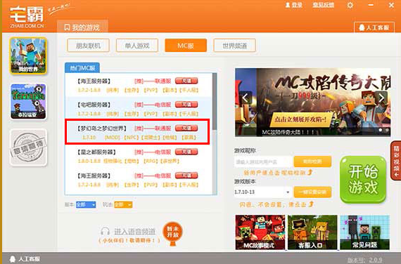 3、點(diǎn)擊開始游戲,宅霸會(huì)幫你一鍵安裝你所玩的MC服客戶端,下載完成后點(diǎn)擊開始運(yùn)行游戲。