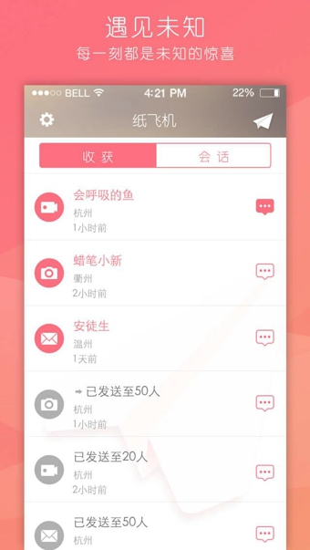 紙飛機(jī)是一款新鮮而又懷舊的陌生人社交應(yīng)用。想要和這個(gè)世界分享些美好的瞬間?拍張照片,一段短視頻,或者僅僅只是寫(xiě)一些話。