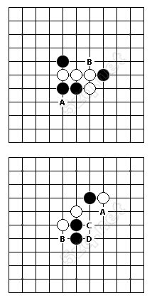 (圖3-1)中白活三,黑有A、B兩個防點來擋住白的活三。由此需要判斷哪個防點,更有利于自己的攻擊。很顯然,走在A點,自己會形成連接,而白棋并無后續(xù)手段,由此在黑防A后,需要回頭來防守黑棋,這樣白就失掉先手。這里,防在A點比B點更有利。(圖3-2)的情況則有不同,黑棋防在A點雖然對自己將來的進攻有利,但黑棋仍然必須防在B點,因為白棋在上面可以連續(xù)攻擊而獲勝。這里提示我們,要判斷哪個防點更有利,就必須考慮在防守以后,對手和自己的后續(xù)攻擊,而后才能選擇出正確的防點。