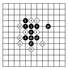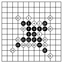 (圖10)也是說明這個技巧最好的例子,白棋設(shè)法讓黑棋在第7手棋開始攻擊,順勢搶占了外勢。而黑棋未能識破白棋的陰謀,在32手陷入了困境。此時,白棋的外勢可保證其獲勝。