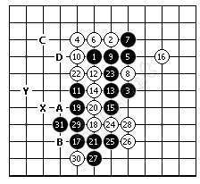 (圖19)取材自流星開局。至31手,如果白棋簡單地在X點防守,黑棋會走A、B獲勝。但是,白棋在此有妙著,可以利用盤端防在Y點,從而避免輸棋。此時,如果黑棋繼續(xù)走A,則白棋可以在C、D連續(xù)沖四取勝。