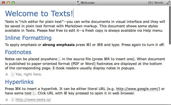 Texts是一款簡潔的純文本編輯器,支持Markdown標(biāo)記語言,能夠輸出多樣化的格式文檔,諸如PDF, HTML, Word, ePUB等。Texts支持豐富的Format,從Heading,Quotation,Comment,Bulleted Item,Numbered Item,圖片,注腳一直到數(shù)學(xué),URL,參考等等。
