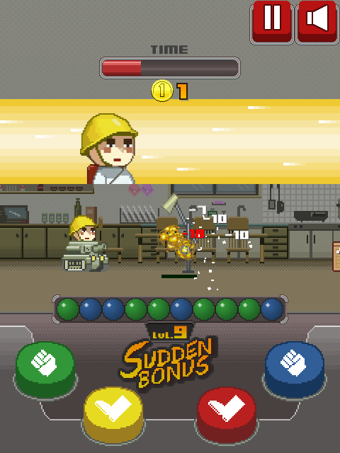 游戲的操作方式很有意思,屏幕下方有4個(gè)不同顏色的攻擊按鈕,而正中間的那個(gè)小小的類似于紅綠燈的東西,就是告訴我們應(yīng)該按那些顏色攻擊按鈕的提示區(qū)域。例如:中間顯示的是藍(lán)綠,那么我們只要按照提示依次按下藍(lán)色的拳頭按鈕和綠色的拳頭按鈕,就可以快速破壞當(dāng)前目標(biāo),而不用依賴初期比較低的攻擊力去一下下慢慢磨血。這是游戲的核心系統(tǒng),也就是讓玩家按照提示來迅速而正確地進(jìn)行按鍵操作。
