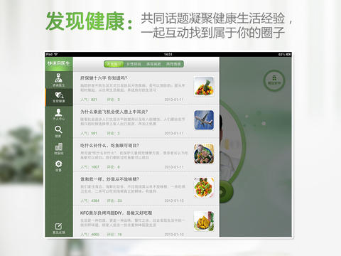你與掌控健康的距離,只隔著一個(gè)APP:快速問(wèn)醫(yī)生,將醫(yī)生裝在手機(jī)里,海量醫(yī)生隨你選,健康問(wèn)題隨時(shí)問(wèn)、隨便問(wèn)。 媽媽時(shí)常上火,口干舌燥,是怎么回事?該怎么辦? 睡眠不足,壓力大,身體亞健康,該如何調(diào)養(yǎng)?為何大便變得不規(guī)律,時(shí)常肚脹?感冒怎么辦?頭疼怎么辦? 哪家醫(yī)院好?哪位醫(yī)生好? ……不用搶號(hào),沒(méi)有數(shù)量和時(shí)間限制,科室齊全。健康問(wèn)題,就來(lái)“快速問(wèn)醫(yī)生”。