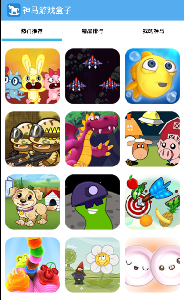 1、在手機(jī)上安裝好神馬游戲盒子之后,打開應(yīng)用,里面全部都是一些精品HTML5游戲,應(yīng)用主要分為熱門推薦、精品排行、我的神馬三個部分