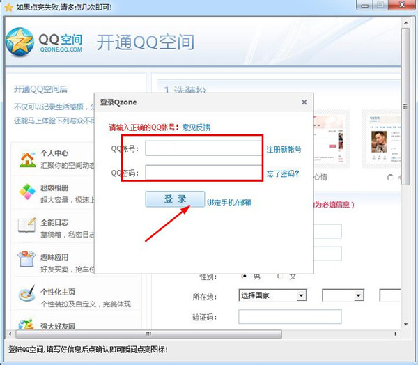 2、輸入QQ號,跟隨他的提示一步步點亮QQ空間圖標