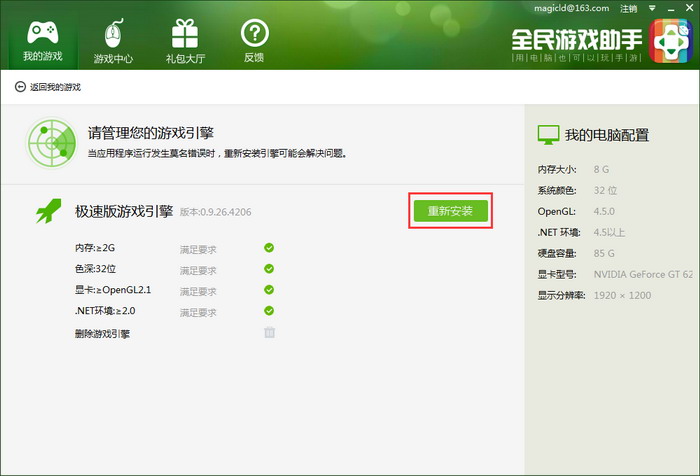 1.在《全民游戲助手》主界面中選擇“我的游戲”標(biāo)簽,并點擊“引擎管理”按鈕。