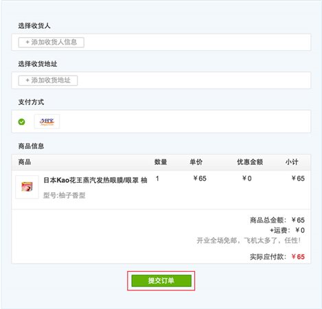 在此頁(yè)面填寫收貨人(目前只填寫收貨人真實(shí)姓名,身份證號(hào)即可),收貨地址,支付寶(目前順豐海淘僅支持支付寶付款),確認(rèn)商品信息無誤后,點(diǎn)擊提交訂單。