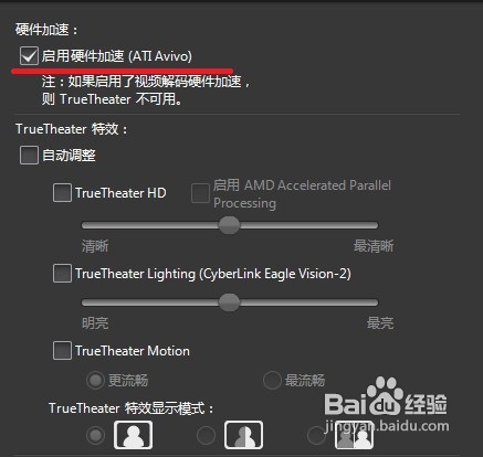 看到TrueTheater特效這一欄,勾選TrueTheaterHD,下面的清晰度自己調(diào)整。如果是AMD的cpu還可以勾選AMD Accelerated Parallel Processing這一項(xiàng)
