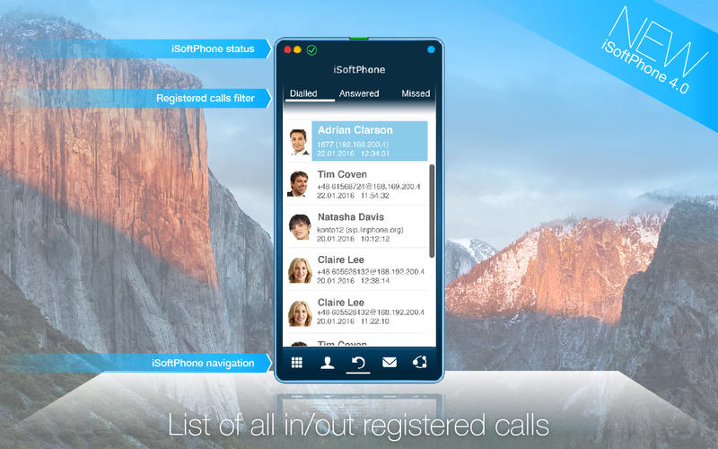 isoftphone Pro是一個(gè)OS X使用VoIP在漂亮光滑的界面提供清晰的語音質(zhì)量先進(jìn)的視頻軟電話??焖倥渲脮?huì)讓你很流暢的和其他用戶進(jìn)行聊天。isoftphone可以讀取OS X的地址簿,打電話和聯(lián)系人管理的功能,用戶只需要說出聯(lián)系人的名字,該軟件就能自動(dòng)進(jìn)行搜索并且撥打電話。基于網(wǎng)絡(luò)回?fù)芗夹g(shù)的“免費(fèi)電話”工具(APP)。這種通話的原理在于,首先是話務(wù)發(fā)起方(用戶)撥打電話,通過回?fù)芷脚_(tái)接入碼(回?fù)芷脚_(tái)服務(wù)器),平臺(tái)接收到用戶主叫號(hào)碼后主動(dòng)掛掉連接(實(shí)際上,中間不會(huì)出現(xiàn)掛斷情況),在設(shè)定時(shí)間內(nèi)以運(yùn)營方的身份回?fù)艿接脩舻脑挋C(jī)上,用戶接通后第一個(gè)通話鏈路建立(此時(shí)對(duì)任何方均無話費(fèi)產(chǎn)生);隨后,回?fù)芷脚_(tái)收全被叫號(hào)后向被叫方發(fā)起第二次呼叫,如被叫方接通電話則第二條通話鏈路建立,同時(shí)回?fù)芷脚_(tái)把兩條鏈路搭通,主叫和被叫通話建立。