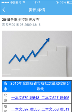 2、彈出后點(diǎn)擊【分?jǐn)?shù)線】,即可跳轉(zhuǎn)到2015年各省各批次的控制分?jǐn)?shù)線列表啦。(如下圖)