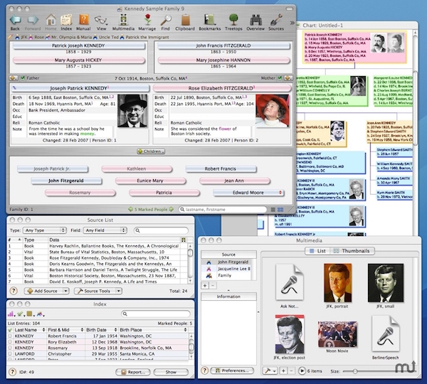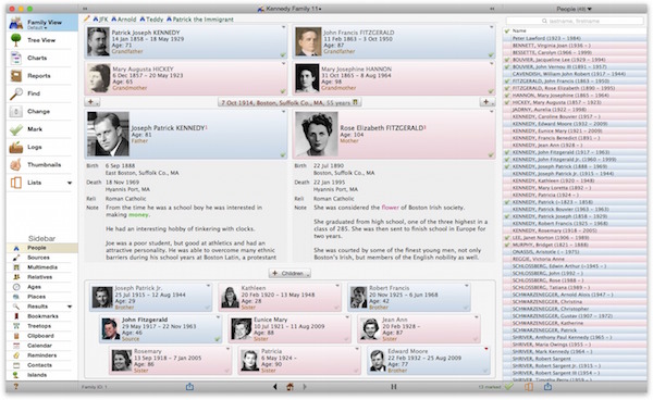 Reunion for mac能記錄存儲和展示各種家族信息,包括血緣的前源后溯,每個(gè)人的生卒簡歷,照片音頻視頻,Reunion for mac可以建立各種圖表、報(bào)告,可以精確計(jì)算出人物關(guān)系、年齡期望等等統(tǒng)計(jì)結(jié)論。甚至可以生成家族時(shí)間線大事記錄等幻燈片,家庭報(bào)告等等。【Reunion軟件特色】