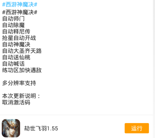 決劫世飛羽是西游神魔決的一款輔助腳本工具。這款腳本的功能非常的強(qiáng)大,支持自動(dòng)師門、自動(dòng)除魔、自動(dòng)釋尼傳搶星自動(dòng)開戰(zhàn)、自動(dòng)神魔決、自動(dòng)大圣齊天路等超多功能,玩家們千萬(wàn)不要錯(cuò)過(guò)啦!【劫世飛羽輔助功能介紹】