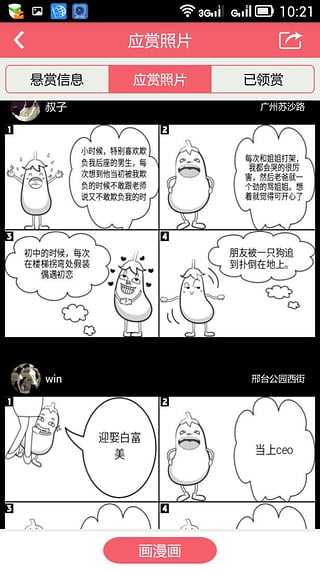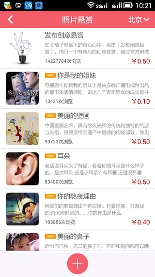“茄子懸賞”是專業(yè)的懸賞發(fā)布平臺(tái);拍攝圖片是完成懸賞的方式。同時(shí),“茄子懸賞”也是智能手機(jī)廣告平臺(tái),為廣大的廣告主提供精準(zhǔn)的產(chǎn)品營(yíng)銷和品牌推廣服務(wù)。企業(yè)用戶可以通過(guò)該應(yīng)用發(fā)布懸賞任務(wù);個(gè)人用戶拍攝照片來(lái)完成應(yīng)賞的任務(wù)。使用方法:企業(yè)用戶點(diǎn)擊“發(fā)布”按鈕,可以按照流程發(fā)布懸賞的文字描述和價(jià)格;個(gè)人用戶點(diǎn)擊“領(lǐng)取任務(wù)”,可以按照流程拍攝照片完成任務(wù)和領(lǐng)取報(bào)酬。