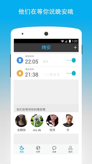晚安、晚安世界、晚安地球人、晚安心語、晚安寶貝、晚安催眠曲、睡前故事、音樂故事和心事港灣、睡前活動、晚安電臺、晚安日語、晚安語錄、晚安短信、晚安英文、晚安圖片、晚上去哪兒、鄧紫棋晚安、林宥嘉晚安、goodn ight,一切盡在晚安世界,歡迎下載體驗。相關應用:我要早睡、睡覺鬧鐘、健康鬧鐘、正點鬧鐘、最美鬧鐘、醒醒、誰叫我起床、誰叫你起床、時間表、晚安吻、微信、陌陌、蘑菇街、美美麗說、貼吧、same、gege、平行世界、社交鬧鐘
